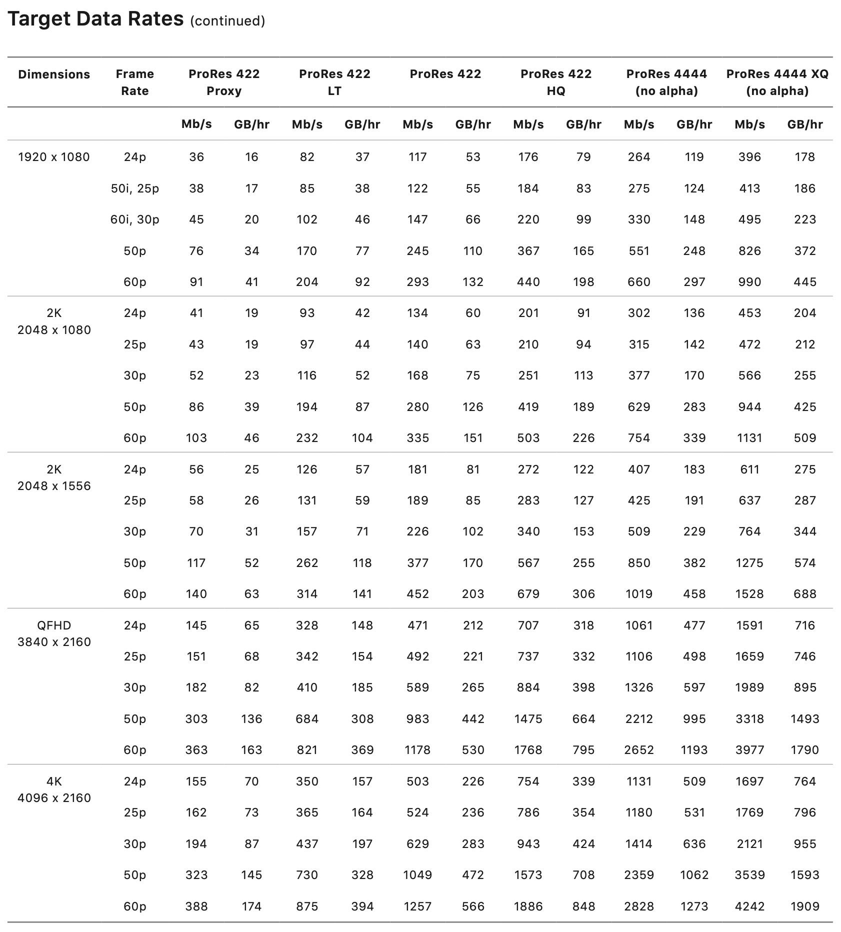 ProRes defines knowledge charges for supported resolutions and body charges — right here’s the White Paper