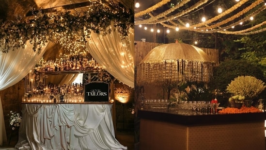 With a nip within the air, an out of doors bar arrange in your terrace is ideal. Add a touch of Indian aesthetic to your bar decor that additionally exudes glamour. Take cues from this milieu that includes a hanging outsized umbrella draped in shimmering gold fringes, positioned over the bar counter. Horizontal garlands of gold tinsek create a magical ceiling impact. Add a recent contact to the counter with tuberose flowers.