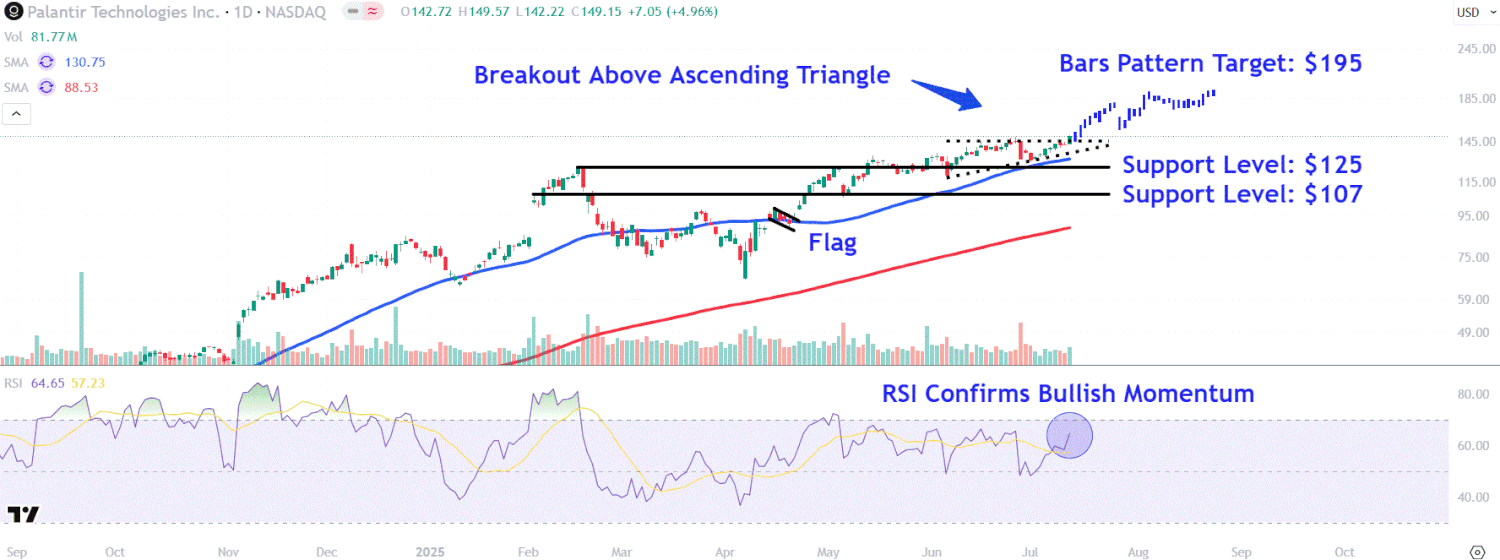 When making use of the evaluation, we extract the inventory’s pattern increased between a previous flag and the ascending triangle and reposition it from the sample’s higher trendline. This initiatives an upside goal of round $195 and signifies the shares may proceed trending till late August if worth motion rhymes with that earlier transfer.